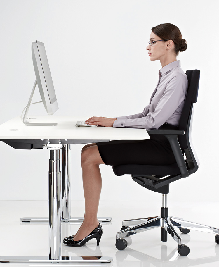 Korrekte Tischhöhe: Sie sitzen aufrecht in einer entspannten Haltung, und Ihre Knie und Ellenbogen bilden einen rechten Winkel. Sie lehnen mit dem Rücken an der Stuhllehne, und Ihre Füße stehen bequem auf dem Boden.